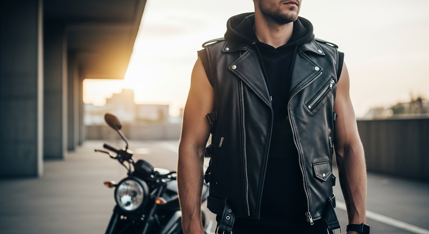 Crest Men’s Motorcycle Leather Vest and Hoodie